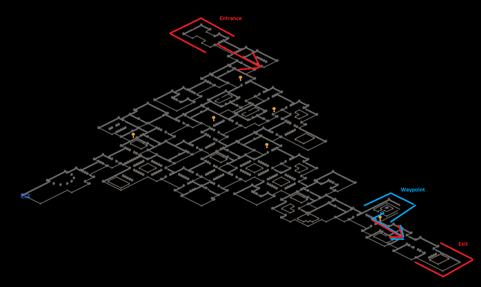 Go straight if you're coming from the entrance. The waypoint is always to the left of the entrance so the exit will always be to the left of the waypoint. Image from D2 lod pathfinding