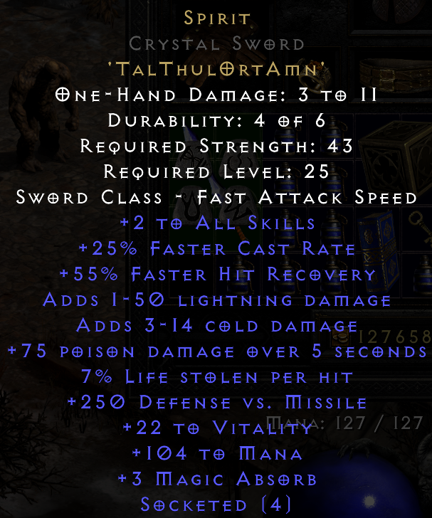 Currently contemplating whether to make a Spirit or Insight first. Increasing all skill levels across the board with Spirit sounds tempting (plus it adds a lot of mana), but mana recovery is an issue (my necromancer is a Mana Potion addict), so Insight would help a lot. I can't make either yet (missing both Amn and Sol) though...