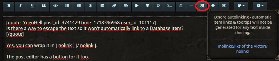 Yes, you can wrap it inYugoHell wrote: 1 year agoIs there a way to escape the text so it won't automatically link to a Database item?