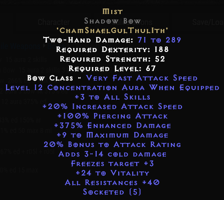 If you do still want to go for Mist for some reason though, the skill choice definitely narrows down the choice of bow. You don't want Mist on your merc because that's just pointless (no benefit for you from Concentration, A1 merc dmg still fails either way..). If anything, you want it yourself. And since with those skills you really only gain from IAS and +skill, you want the fastest base with skills. I.e. a +3 matri bow.