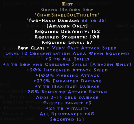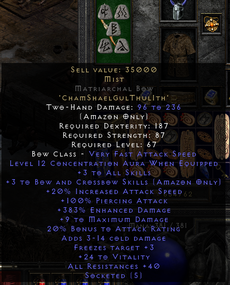 Really, though, I'd probably farm cows or the pit for a better zon base. Since Mist is a 5-socket rune word, you can take any decent 5 max white bow and use a Larzuk quest on it.