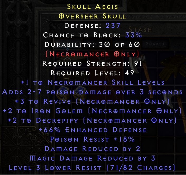 Anyways, the only real usage of this item is that it saves you 5 hard points you'd otherwise spend in Revive, decrep and prerequisites. It would be good if it had +2 nec and all res to make the Homunculus look like less desirable alternative. But since it has none of it, it has much less value, at least in my eyes.