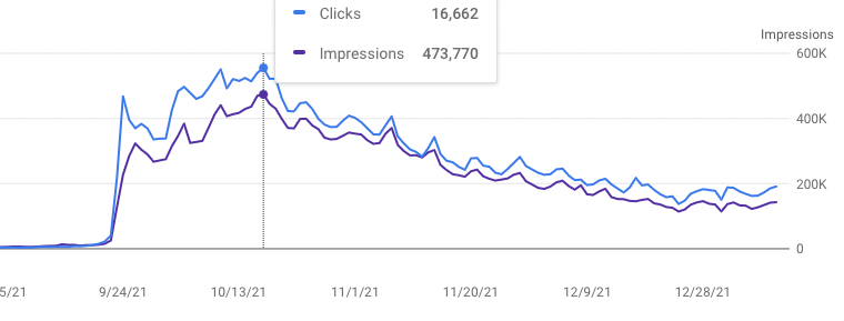 Again, you can see the huge spike around release with about 400k impressions per day, which has since Fallen to about 150-200k impressions a day. The 'position' ranking not drawn on this chart is fairly steady, so whilst the 'performance' of the site has remained level, the external interest has definitely significantly dropped during that time.