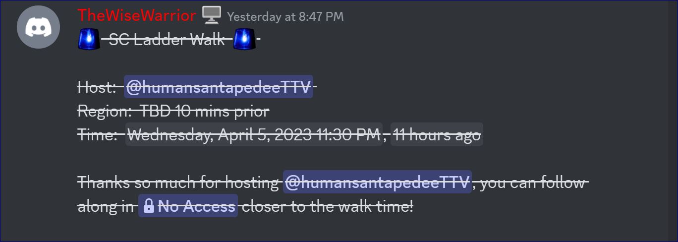 A number of people in the forum rely on the posts made in this thread to prepare for a walk. Many of those posts are done days before a walk and the time set for many are "region TBD 10 minutes before walk." The D-Clone Hunters are very reliable when it comes to posting walk times, but not for this one. If you know in advance when a walk is going to happen you can share it in this thread, and it will be appreciated.