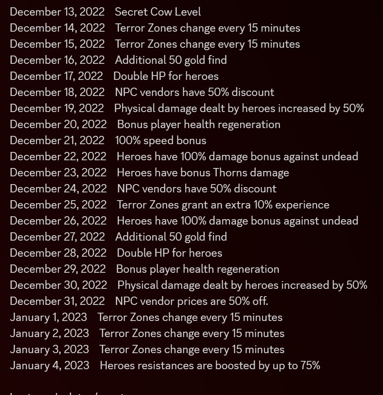 I pulled this from Discord. If it follows the same Pattern as last year then the events will be the same and they will start on Dec 13. (Edit)