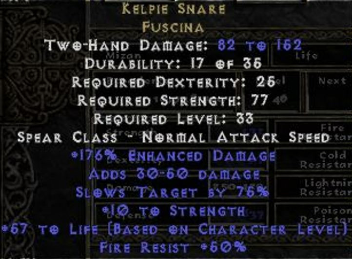 ethereal, upgraded w/ 40/15 jewelSnakecharmed wrote: 7 months agoKelpie Snare is such a great leveling merc weapon. If your merc is able to get in a hit, it breaks Baal. If the rest of its stats were better, it could have had more potential as a higher end merc weapon option instead of being a niche item.
