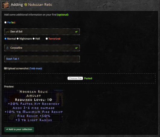 • If you're doing your grail online, or editing existing auto-imported grail entries, you can manually add a bunch of details about the item find: a screenshot of the item, 'Perfect' and 'Ethereal' tags, the area in which the item dropped, whether the area was terrorized, the difficulty it dropped in, the monster variant (or NPC) from which the item dropped/was gambled from, and a small 'notes' section that you can use for any further details like the mule/character name or short anecdotes/personal comments. You can also delete grail entries from here.