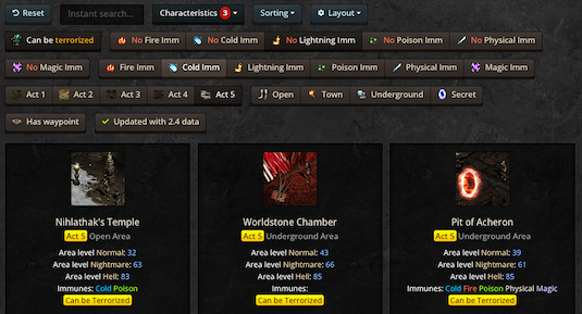 • Each area now shows which monster immunities exist within it (on Hell difficulty). These immune indicators can be found on the Areas database category page, the individual database entry pages for each area, and hover tooltips for each area.