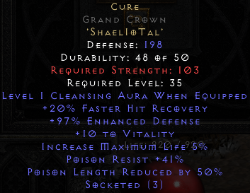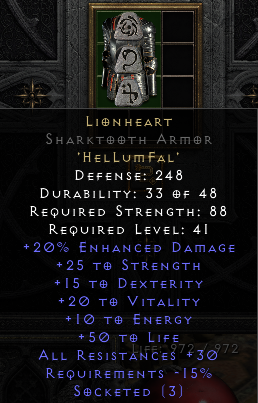 Yes yes, I know, it's a medium weight armor so there's a -5% FRW penalty, and less resistance than a Smoke, but but but it looks good and the rune word name fits perfectly with my character's name!