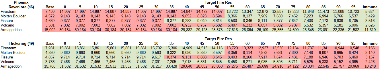 The above shows the actual, raw, theorycrafted damage numbers (base dmg sourced off maxroll for the time being), taking into account everything from %dmg to -res. The confirmed expected outcome is that on no-res targets, flickering wins hands down, simply because you can add 3 more skills vs. "only" 5% dmg as the target res will be capped at -100 for both, meaning the extra -10 res do nothing. As your target resistances go up however, the -res from Raven quickly becomes more important and a bigger factor. For Firestorm, Fissure and Armageddon, Ravenlore starts being superior with as little as 10 fire res on your target. Molten Boulder at 55 res. And Volcano as the straggler at 95 res. Come 95/Immunes, Ravenlore wins across the board.