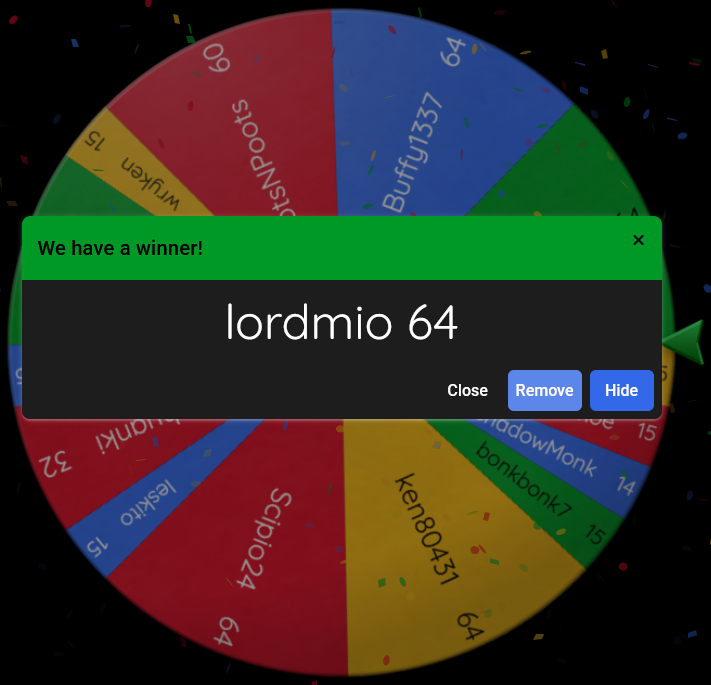 The first winner of the sixty-fifth round iiiiiis.... @lordmio, who had a 12.8% chance to win! (out of 14 participants)