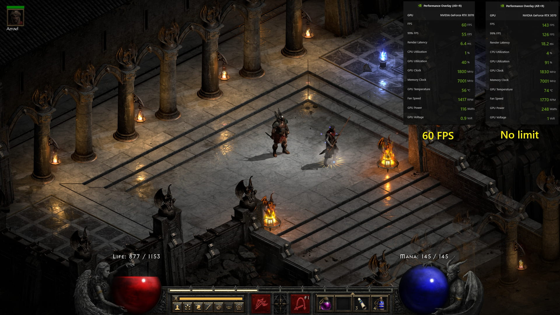 I am using RTX 2080 8gb. Gigabyte Aorus with my own OC using i7-10700k to 5.0 locked all cores. D2R is running on 4096 x 2304 12bpc. (that is True 4k DCI resolution using DLAA btw, not 4k ohhh its 4k. no no. its the actual 1 to 1 full render of D2R... and in HDR600 calibrated)