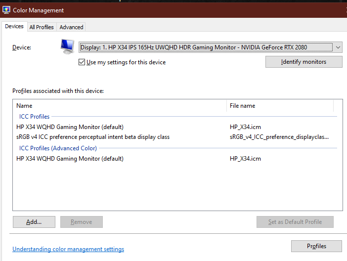 I am using the HP X34 WQHD Advanced ICC HDR Colour profile by forcing the off-Brand monitor to think it's an HPX34. The display panel is (exactly) just a different shell; I then calibrated it.