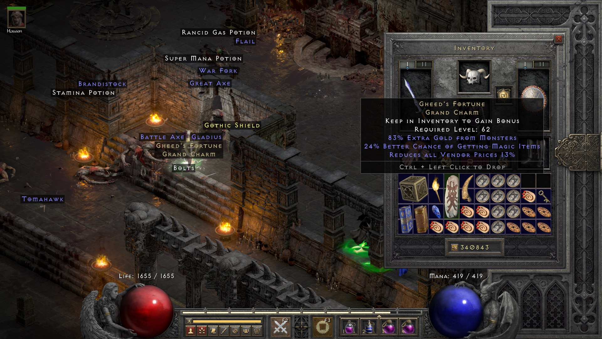 Left my (35 mf I think) Gheed on the floor, went back to Lut Gholein, and what had to happen happened : a disconnect. My single disconnect for weeks at the only time I left something on floor. Next time, I'll drop ID book and keys instead !
