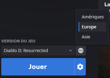 The launcher's region is set via the gear icon on the launcher login screen: And D2R's region is set via the globe near the "Play" button; What's important to note is that if you change the region for the launcher (with the gear icon on the launcher's login screen), the game's region selection will still default to the last region you launched D2R on. So in my case I had last played D2R on EU, I just logged out my launcher, changed launcher region to NA, then logged in again - and D2R's region still defaulted to EU as that was the last region I played on.