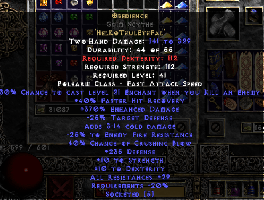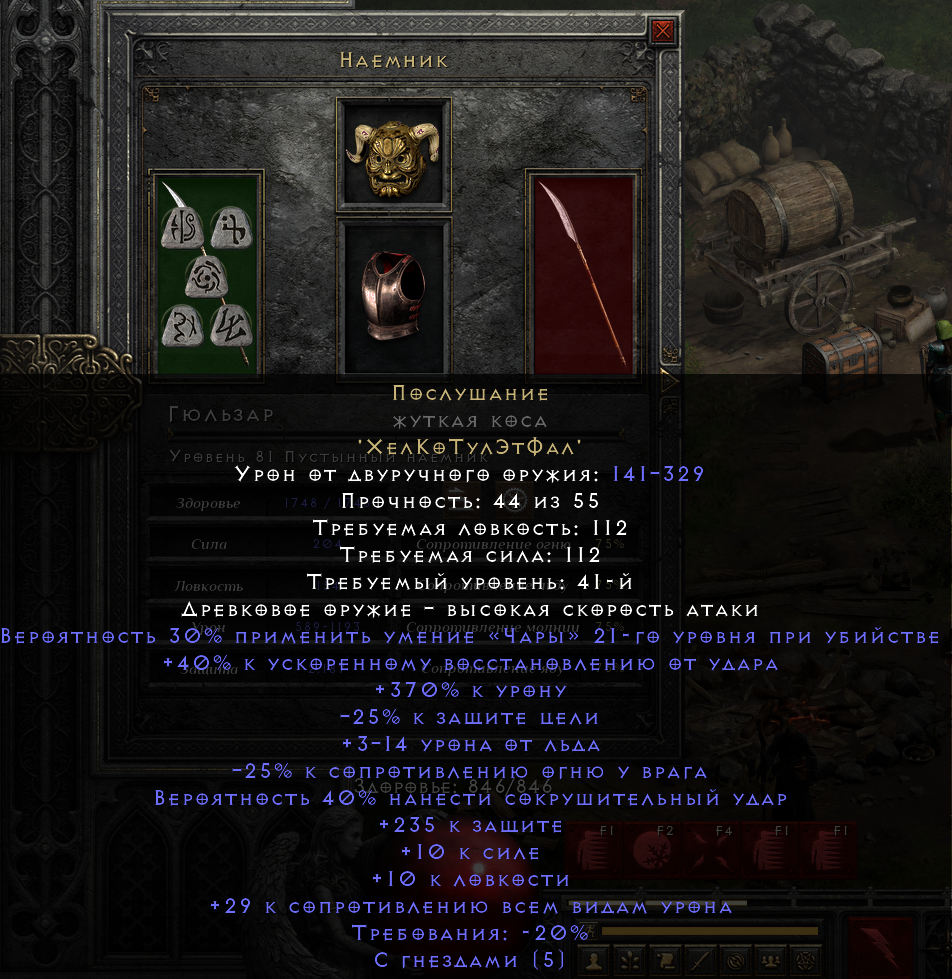 Okay i am waiting for lvl-up of my merc, Thanks for helping me guys.Lapwaire14 wrote: 4 years agoAs I said earlier in the post, there is a dexterity bug. Your merc needs 112 base dex to be able to wield this weapon.. I have the same problem with my barbarian for Grief.. Trust me, you have to wait and lvl a bit before you can give it to him