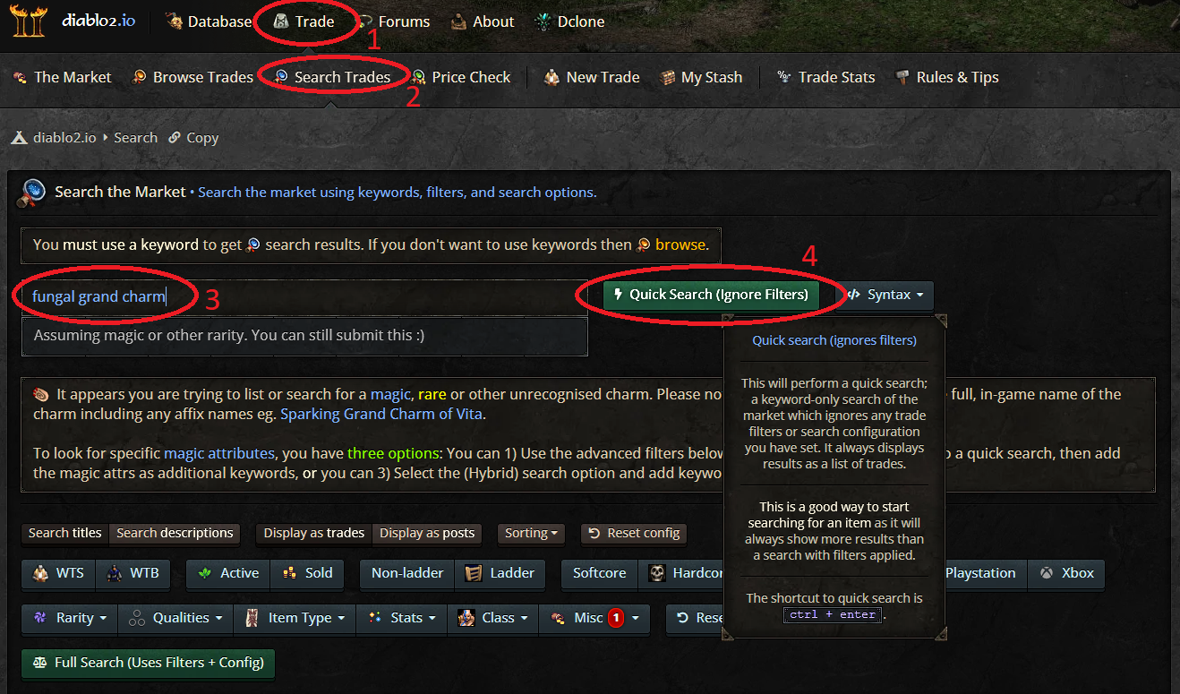 3) Go to Trade -> Search Trades and enter the full name ("Fungal Grand Charm") to search for it.