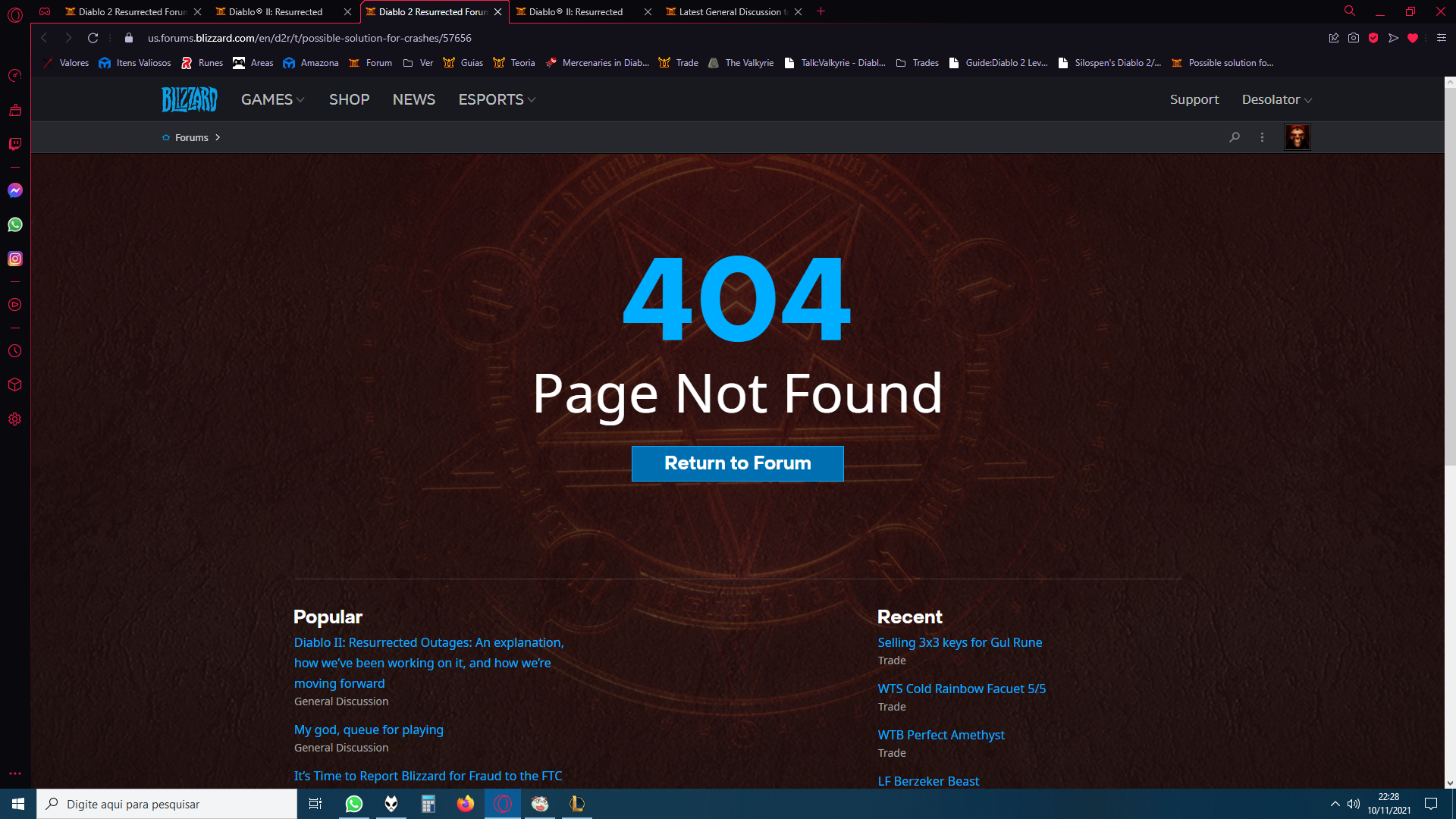 HI all, first post here. Will be as fast as I can. After playing D2R within crashes after crashes, and worst, any other software like: Fiferox, Opera, WhatsApp(Win), Chrome, etc etc that I used while playing D2R started getting crazy and crashing without stop. I found a solution that maybe help others as well. Since we all nowsdays use SSD, 16 GB+ Ram, we are used to disable Virtual Memory for the good sake of our SSD life and performance. But since D2R is a bad remake with old code, I turned turned ON virtual Memory on my old HD that I use as backup. All that D2R instant crashes went away, same for any programs that used at same time while playing. The game is 100% playable again now. Rarely got a crash, blizzard asked to send my blood to Cardassians, I refussed. "Live long and prosper"