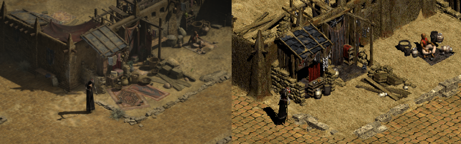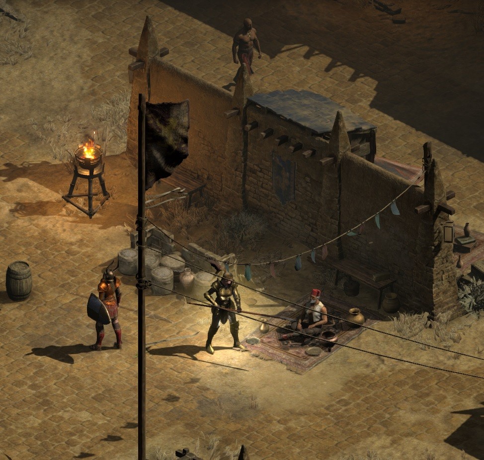 I'll try to explain the location of the Blue Carpet Man which is interesting more so now with the D2R Enhanced Graphics. His location is at the South side of Town just outside the Walls on the Right. With the Enhanced Graphics you will see the Carpets there just as you do next to Cain. However when you go back to Old School Graphics. Those Carpets Vanish! Same goes for the ones next to Cain, Unless the Man is Sitting on them.