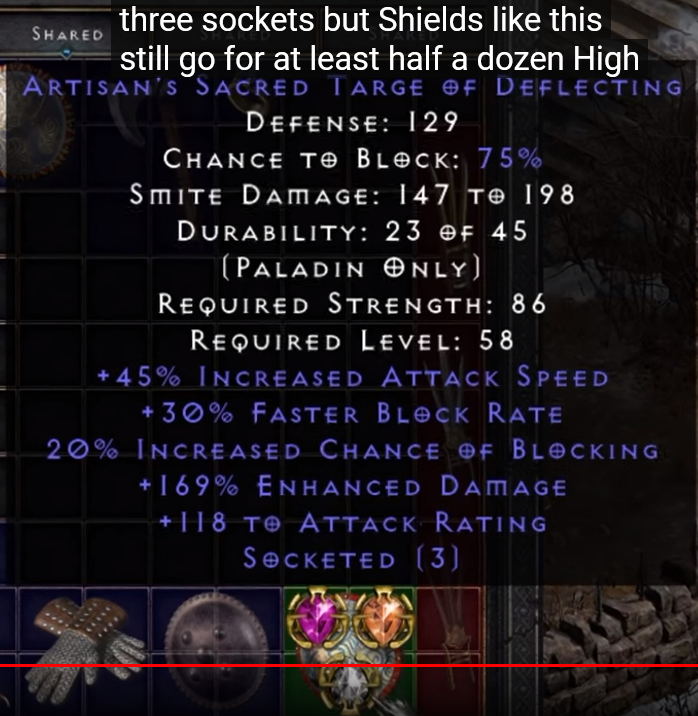 That said, the above doesn't apply to too many builds as res does often remain easiest/most efficient to get via the shield. Hence ed/ar shields being worth little to nothing by comparison. Additionally, because hardly anyone wants one to begin with, any that aren't perfect (i.e. only 60 ed as noted here) have even less value and can really just be left with Charsi (based on the few trades I've seen of them over time). 65/121 is too easy/cheap to get to bother with anything lower for the 3 people that do want one.