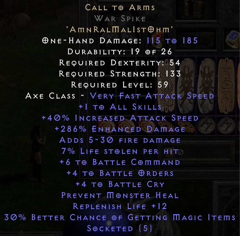 Seriously, if anyone happens across a 5-socket War Spike, or even a White one that I can cube-gamble on, please do be so kind as to let me know! Happy to tip you for the assist on a 5s (or a successful cube).