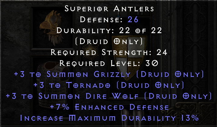• Druid Pelt +3 Summoning Skills, +3 Grizzly, +3 Dire Wolves