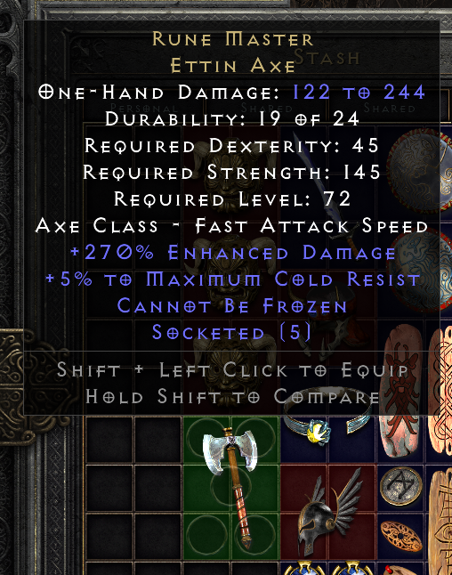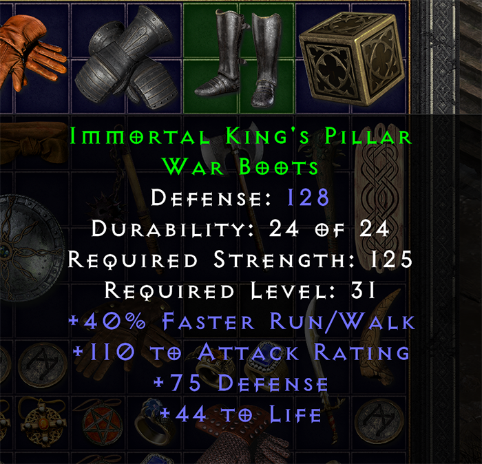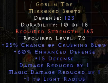 Here is a perf exceptional Goblin Toe (using it on my smiter):ShadowHeart wrote: 4 months agoNow up it to exceptional and see if it rolls perfect defense. And then, if it doesn’t, up once more to elite for a second chance at perfect defense.gensymmed wrote: 4 months agoBoth of these nice lower-level perfects dropped today. Stormguild and Goblin Toe.