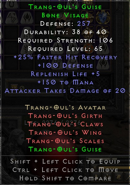 I got Trang-Oul's Guise +100 Defense 257 total.