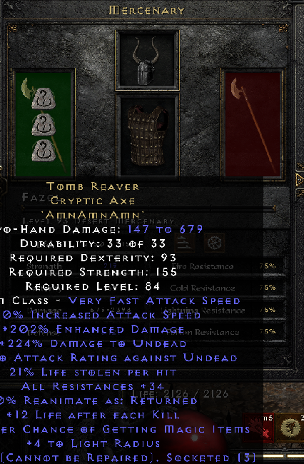 Or even something simple as Djinn Slayer socketed with 2x Amn and Frostwind (or even more budgety Headstriker), with Treachery (or even mega budget options something as simple as Skin of the Vipermagi or Rattlecage or Rockfleece) and whatever helmet (I can see CoA going hard for this combo) for Act 5 Merc. I had something very similar to this and he was very rarely in danger of dying for my best budget build (can't even remember which build it was but I want to say Cold Sorc probably or maybe it was my Cold Druid). Unbending Will is another very solid budget option for a Barb Merc for a weapon... Lawbringer as well, how could I forget that one... There really are options out there!Morgormir wrote: 3 months agoact 2 merc with Andariel's Visage + Eth Tomb Reaver with 3 Amn and literally anything else will never die outside of Ubers unless you're afk. Also Gface on a merc is a fast boss killer too.