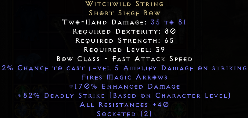 Items I’m using include Guillaumes face with 15 IAS Jewel, Fortitude armor, 20% IAS Blood Gloves, Gore Riders, 10% IAS Nostferatu’s coil, Raven Frost, a rare ring with 5% ML, and Atama’s Scarab. The Witchwild was upped to a Diamond Bow. The two sockets are filled with a Shael and a 39% ED +9 to minimum damage Jewel. The breakpoints for the bow is 56% IAS, I have 65 IAS total. I also have 60% CB, and 10% Open Wounds. The only expensive item in the build is the Lo rune in the Fortitude.