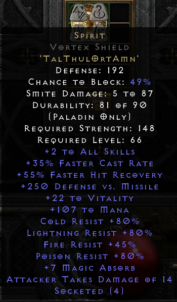 I was looking for a 35 FCR / +100 mana / 8 magic absorb Spirit (like anyone else), but after rolling dozens of dozens of times this is the closest I got.
