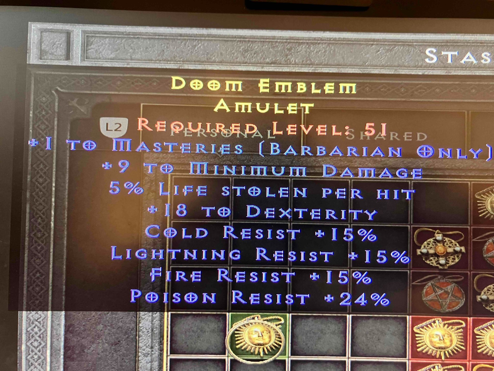 amulet : 1 to masteries, 5% life leach, 18 dex, cold,light, fire 15% + poison 24