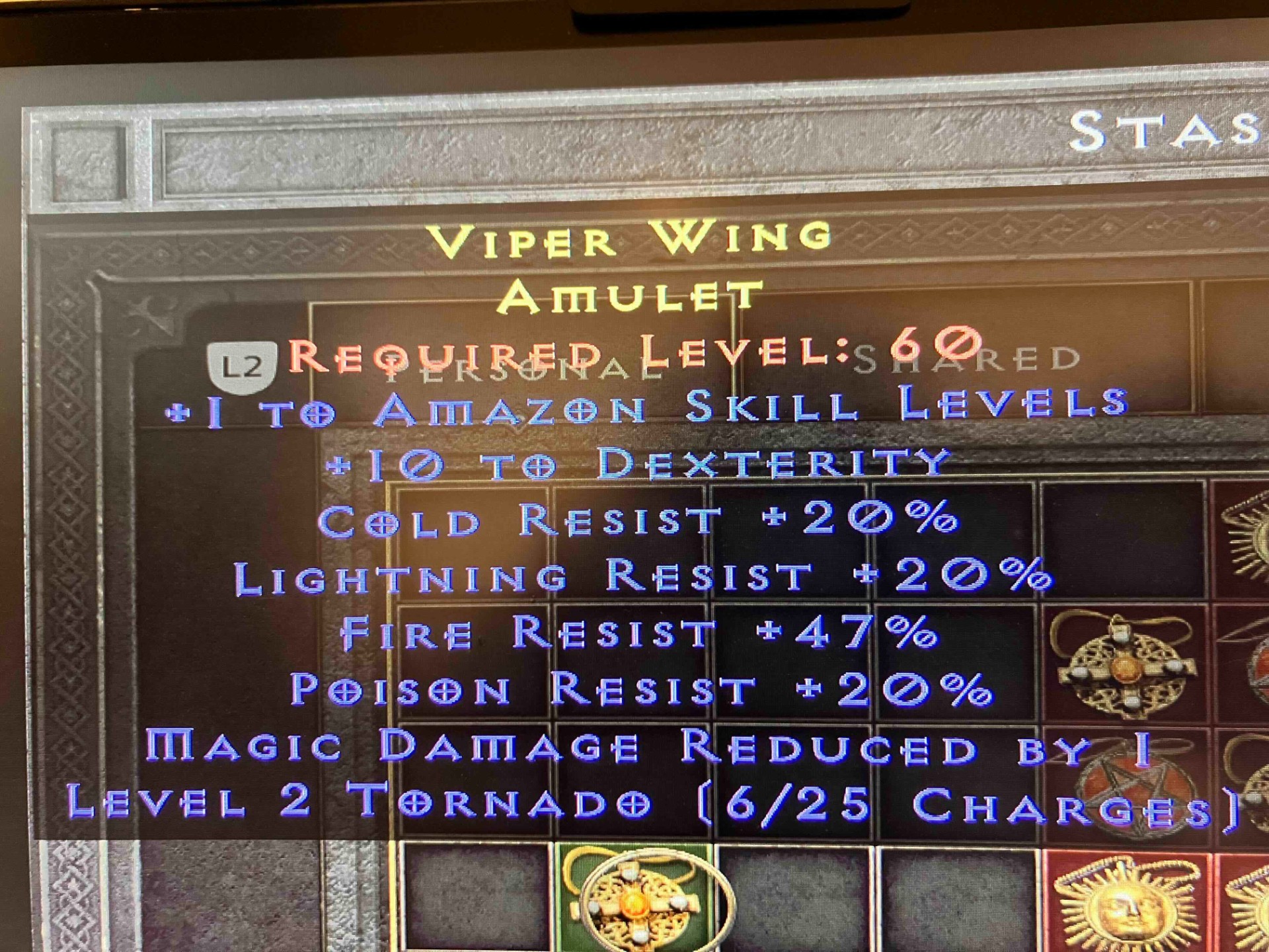 amulet : 1 to amazon skill, 10 Dex, cold, light poison 20%, fire 47 --> i like this one...