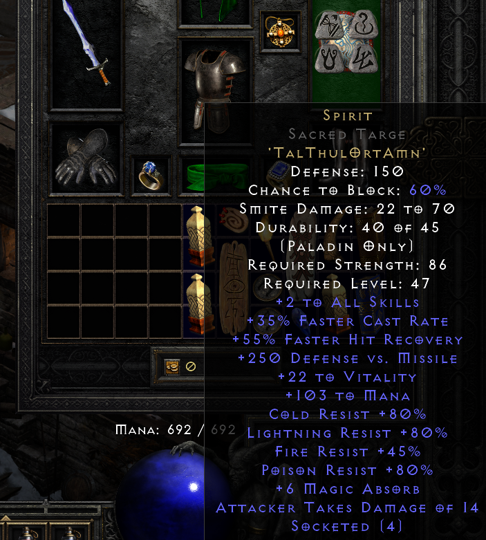 Probably both the best Sacred Targe I've found and Spirit runeword roll combo I've gotten so far.