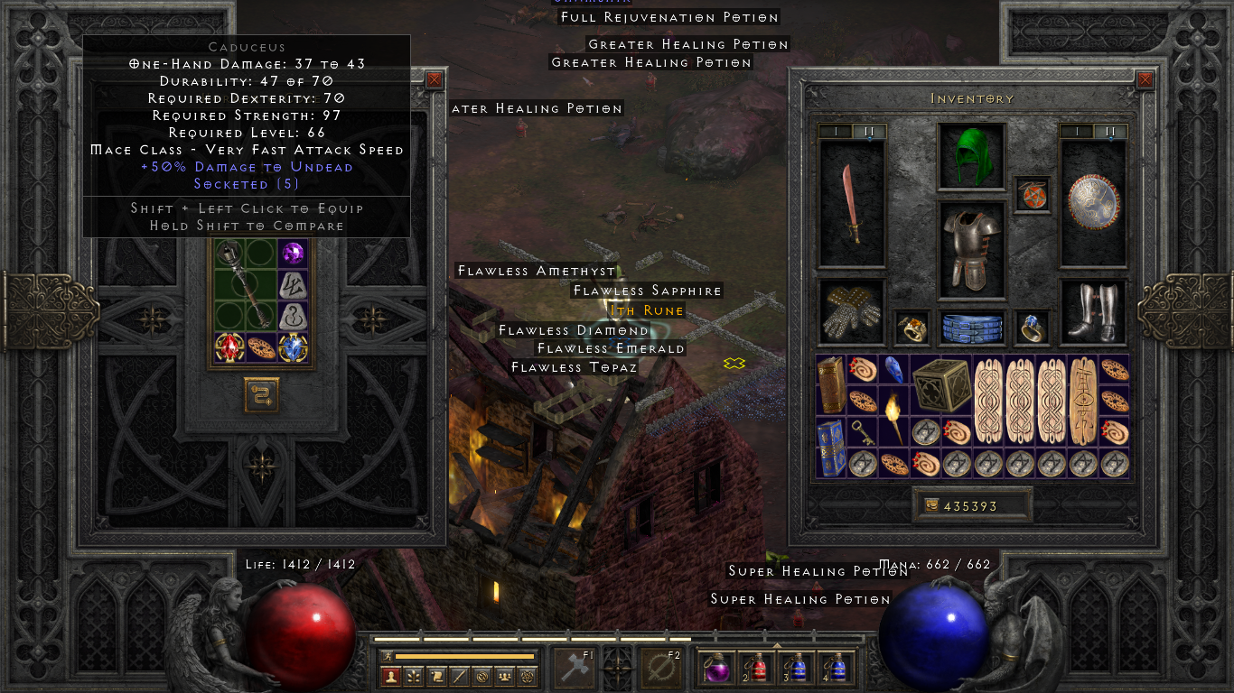 A rare 5 socket Caduceus. Could be a good base for Beast runeword? It requires much less strength compared to Berserker Axe, gaining more points at vitality overall.