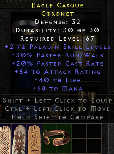 Usually I consider a Shako a nice find but not a really lucky find, but this has been a fortunate Nightmare level run for Bambi (SF barbarian). So far he's gotten an Um drop for Hellforge, found a Butcher's Pupil used to kill NM ancients and Baal with no issue, an Arreat's Face, and now a Shako. I hope Hell Level is just as lucky.