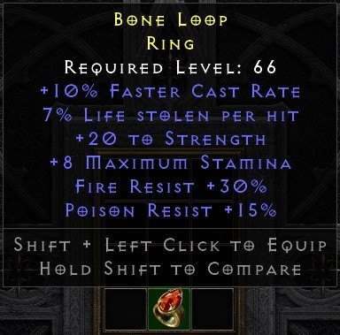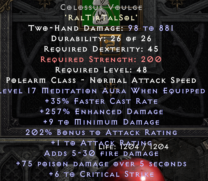 10 FCR, perfect 20 Strength, perfect 30 Fire Res, Life Leech 1 off perfect ... If it just would have a different second res and/or Mana/Life on it ... A close call