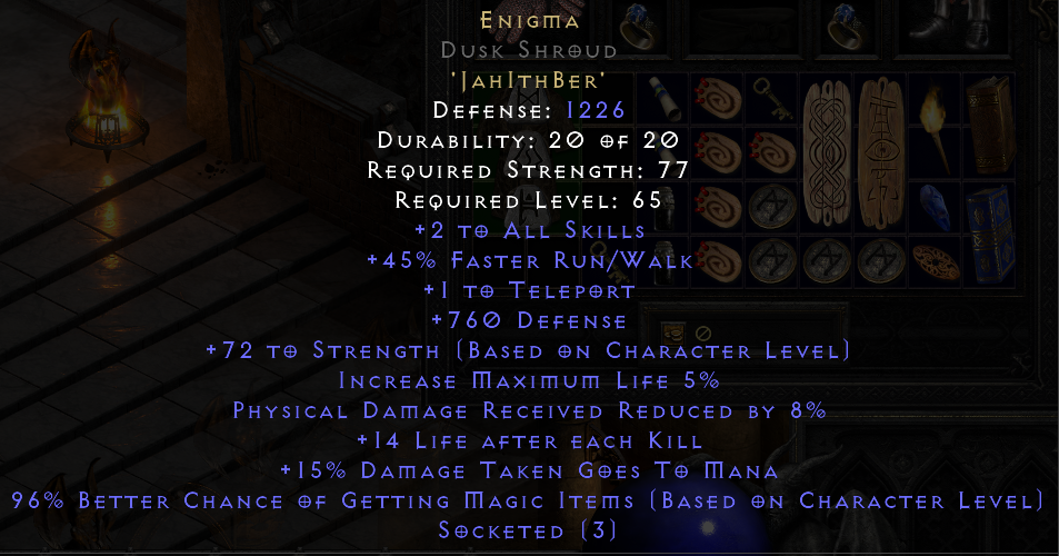 I found a Sur rune in Lower Kurast. I cubed it up to the Jah I needed and made my first offline Enigma.