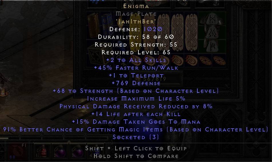 My first HR dropped while leveling through Act 3: Shortly after, I found another HR while doing Countess: While grinding TZ Worldstone Keep (WSK), I found something I have never imagined I was able to find, especially at less than 100mf: and it rolled a perfect -20 to enemy: And that's not all, I found BOTH Ber and Jah in a single day, during TZ WSK and CS: which rolled into a pretty high def Enigma: and lastly, the icing on the cake is a perfect BO roll to my CtA: This season is truly beyond my imagination in terms of the bountiful experience I have been through.