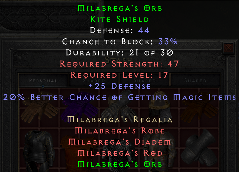 This tool provides a means of tracking and sharing your progress towards the Holy Grail. Completing a standard Holy Grail means collecting all Uniques, Sets, and Runes in the game. When marking each item as found, you may include several details about the drop. If you are playing offline, you can also upload .d2s or .d2i (Shared Stash) files to automatically import your collection.