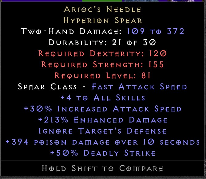 • 178/200% ED, +12/30 maxdmg,49MF. Amazon weapon