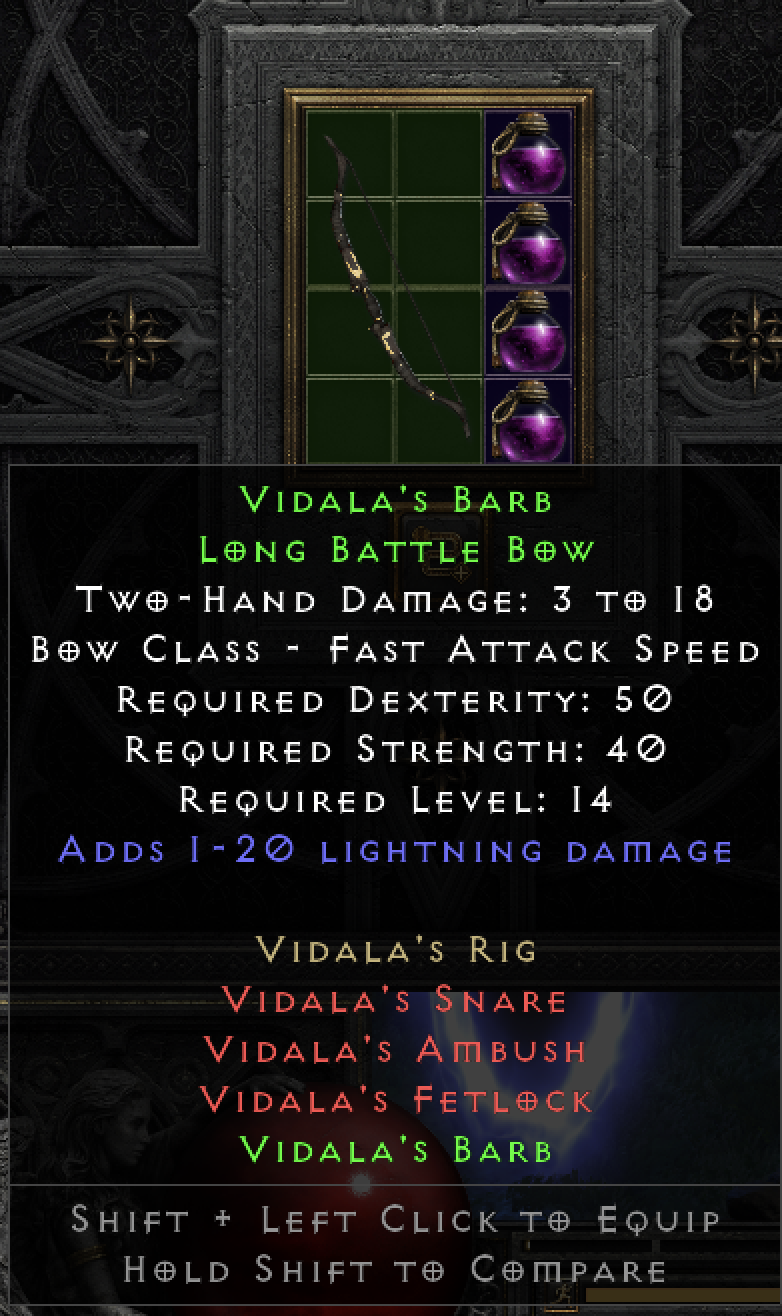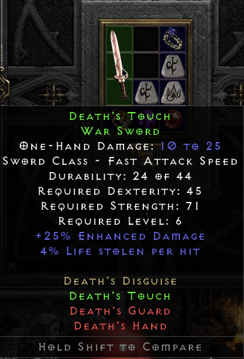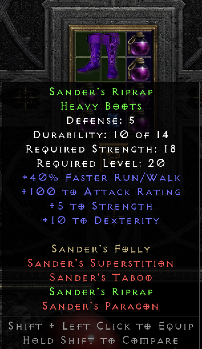 This tool provides a means of tracking and sharing your progress towards the Holy Grail. Completing a standard Holy Grail means collecting all Uniques, Sets, and Runes in the game. When marking each item as found, you may include several details about the drop. If you are playing offline, you can also upload .d2s or .d2i (Shared Stash) files to automatically import your collection.