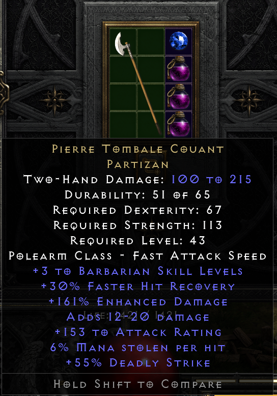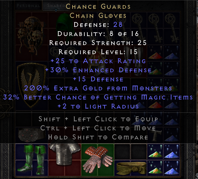 This tool provides a means of tracking and sharing progress towards the Holy Grail on LoD. Completing a standard Holy Grail means collecting all Uniques, Sets, and Runes in the game. When marking each item as found, you may include several details about the drop. If you are playing offline, you can also upload .d2s or .d2i (Shared Stash) files to automatically import your collection.
