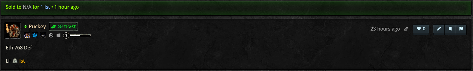 Not exactly sure if the time lines up but I edited the post to decrease the price and bumped it at least once yesterday, yes.Teebling wrote: 4 years agoAs for the second one, yeah that's weird that it is changing the timestamp from 5 days to 23 hours ago. I'm guessing 23 hours ago you bumped the trade?