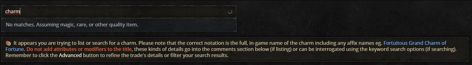 Good question, I see that for example skillers have the name grand charm in the title, so I guess ring will be part of the title too, not sure though.PrincipalOShagH wrote: 4 years agoI assume yes, not sure if "ring" is part of the name or should be specified in the advanced tab of the trade though.Afura wrote: 4 years agoI see thank you. So my example with the ring is correct?PrincipalOShagH wrote: 4 years agoimage.png As soon as you put the word charm, this message pops up answering your question