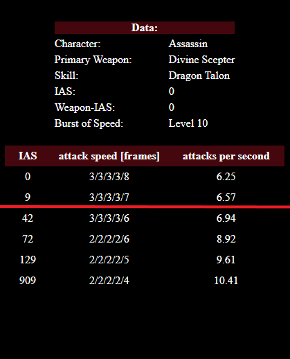 Just search for "diablo 2 ias calculator" or the like to find an online calculator. The table above is for a Divine Scepter (WSM of -10 I do believe) and will be different for weapons with different WSM values. Also, the Burst of Speed level will change the table as well.