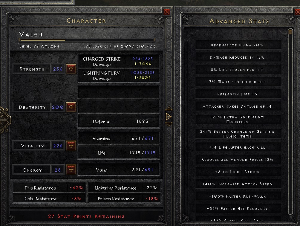 really? that would be amazingxSD wrote: 4 years agoCan toss you a spare token to respec again if you need!MrBarra wrote: 4 years agoI accidentally waste my 2 last respecs. I was really really sleepy and messed up two times.rango_jr wrote: 4 years agoI'm not an expert in Javazons (building mine now) but from what I've seen the only thing i'd suggest is doing a respec with your gear (specifically torch and anni) equipped. You could probably take off a ton of str and dex and get a lot more life.