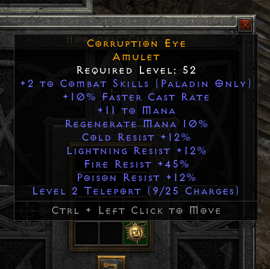 +2 Combat Skills pally amulet, 10fcr, 45 fire res, lots of other res, lvl 2
