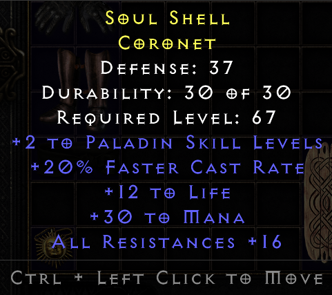 +2 Pala / 20 FCR / 16 AllRes / 12 Life / 30 Mana Coronet