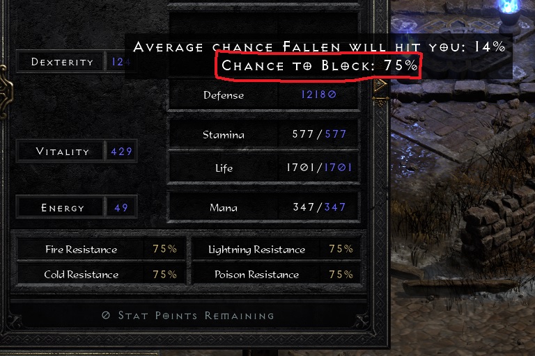 Is there a specific enemy or tool used for benchmarking max block? I notice that block chance vs Diablo is less than your average Fallen for instance.jbmc wrote: 4 years agofor dex - activate Holy Shield and add points until you see your block get to 75% then you can put all the left over points into vitality (if your Holy Shield isnt maxed out yet then the points you put into it will save you from putting some points into dex).